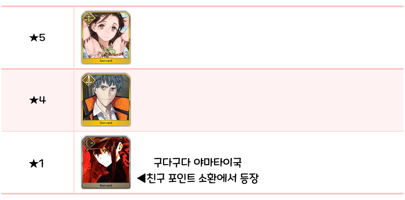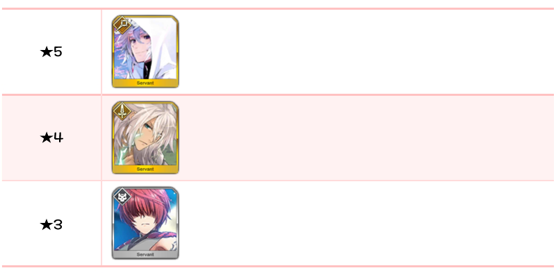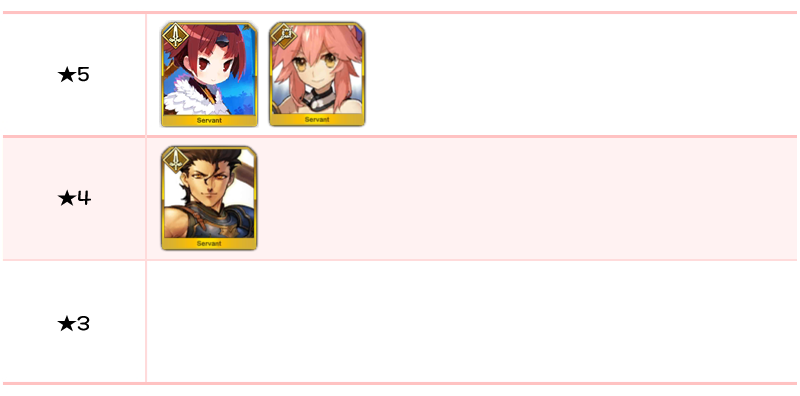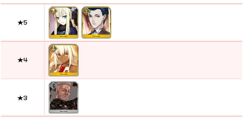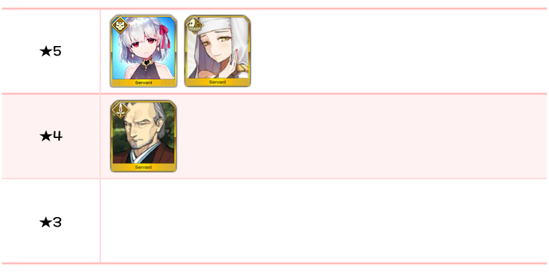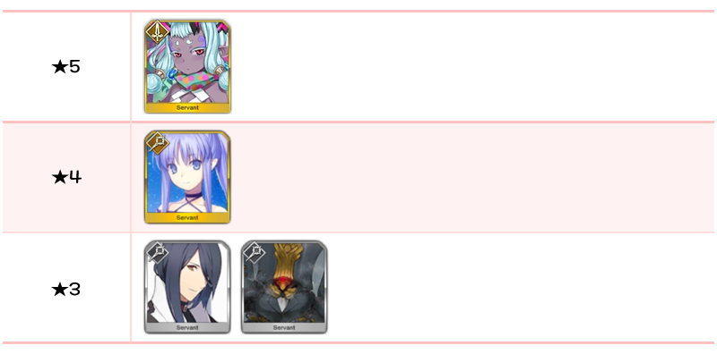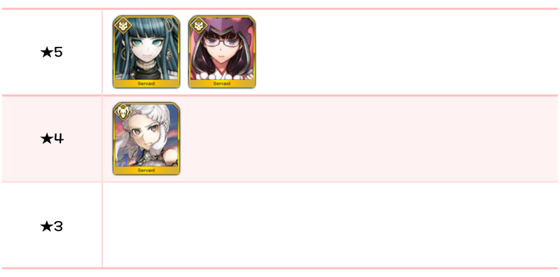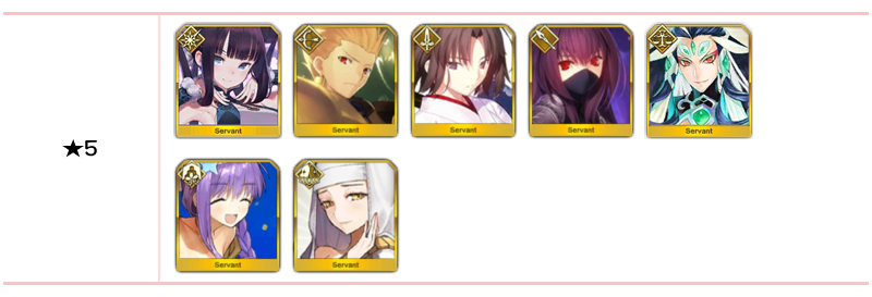 ★5 세이 쇼나곤, 알테라, 오리온, 알트리아 펜드래곤(랜서), 에우로페, 아나스타샤, 오사카베히메, 나이팅게일, 시토나이, 알트리아 펜드래곤(세이버), 브라다만테 / ★4 마리 앙투아네트(라이더), 시바의 여왕(미드라시의 캐스터)