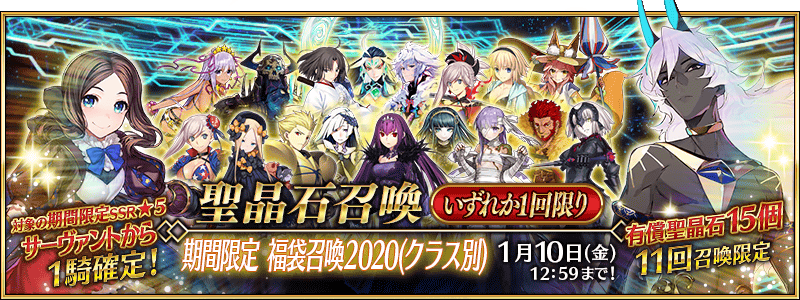 ▶복주머니 소환 2020(2020. 1. 1 ~ 1. 10) -5성 확정 가챠 ※한 가지 클래스만 가능 ※5성은 한정 서번트(양귀비 제외)만 등장, 4성 이하는 한정 제외