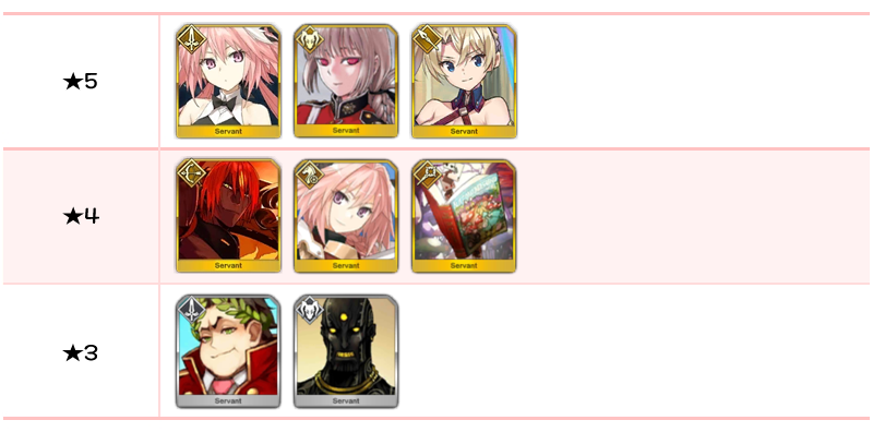 ★5 아킬레우스, 아스톨프(세이버), 아마쿠사 시로, 세미라미스, 모드레드, 잭 더 리퍼, 블라드 3세 / ★4 지크프리트, 아탈란테, 케이론, 아스톨프(라이더), 아탈란테 얼터, 프랑켄슈타인 / ★3 아비케브론