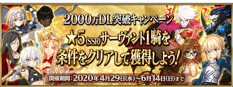 ▶2000만 DL 돌파 캠페인 5성 서번트 교환권 배포(2020. 4. 29 ~ 6. 14) ※상시 서번트만 교환 가능합니다.