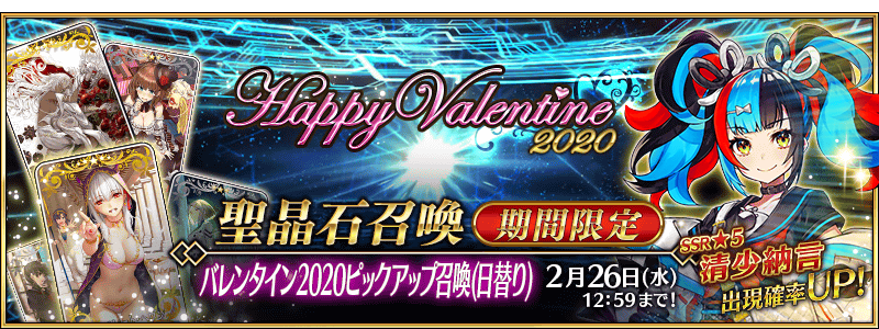 ▶발렌타인 2020 픽업 1조(2020. 2. 12 ~ 2. 26) ※여성 서번트만 등장 ※1조와 2조의 픽업 기간이 다릅니다. 주의해 주세요.