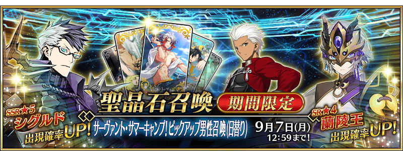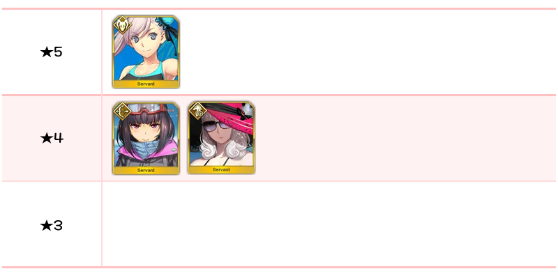★5 잔 다르크(수영복), 네로 클라우디우스(수영복), BB(수영복) / ★4 엘레나 블라바츠키(수영복), 모드레드(수영복), 마리 앙투아네트(수영복), 우시와카마루(수영복), 니토크리스(수영복) + 상시 대군 보구 서번트