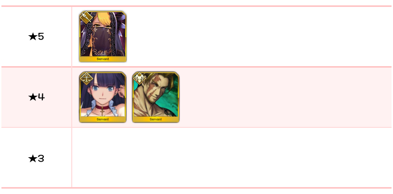 ★5 산의 노인 / ★4 메두사(아나), 길가메시(캐스터), 고르곤 / ★3 재규어맨, 우시와카마루