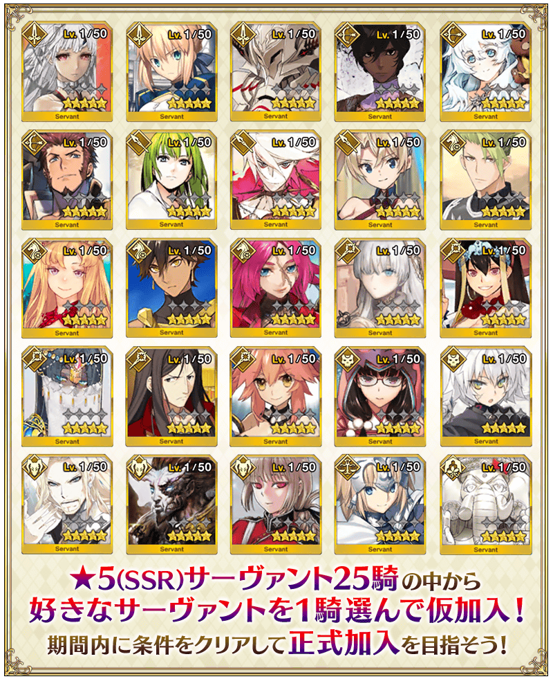 ※교환권을 사용한 5성 서번트는 ‘임시 가입’ 되며 기간 내에 다음 조건을 만족해야 정식 가입됩니다.