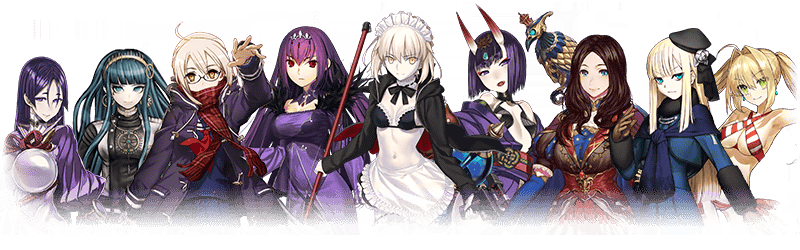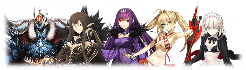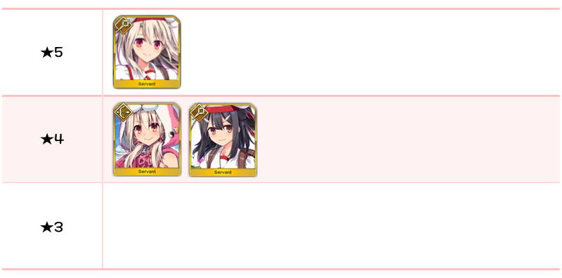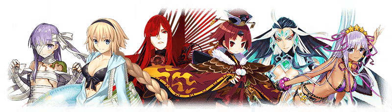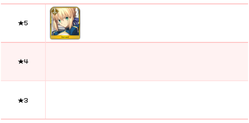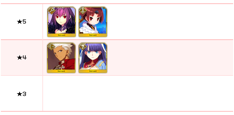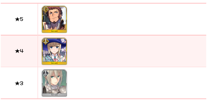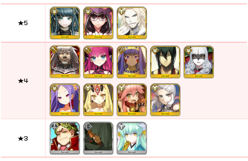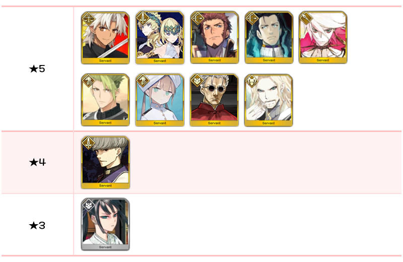 ★5 아마쿠사 시로, 아르주나, 엘키두, 오지만디아스, 오디세우스, 제갈공명, 쿠 훌린 얼터, 항우 / ★4 와타나베노 츠나 / ★3 형가