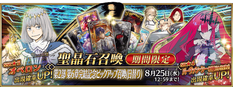 ▶6주년 기념 복주머니 소환(2021. 8. 1 ~ 8. 15) -5성 확정 가챠 ※12가지 중 하나만 가능 ※5성 서번트는 한정 서번트(빛의 코얀스카야 제외)만 등장, 4성 서번트는 한정 포함 등장, 3성 서번트는 한정 제외