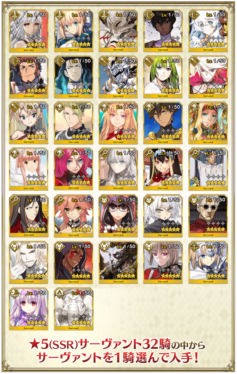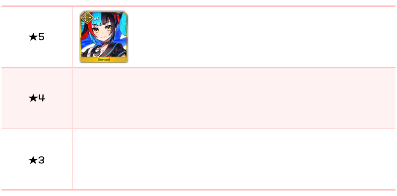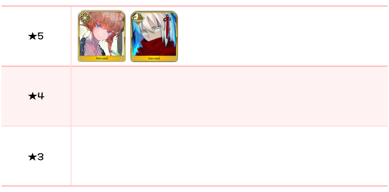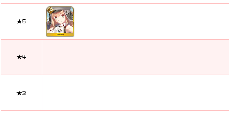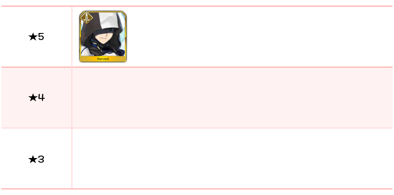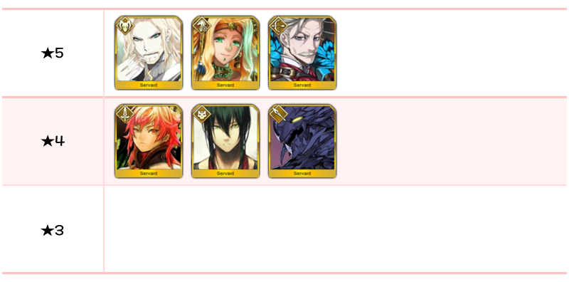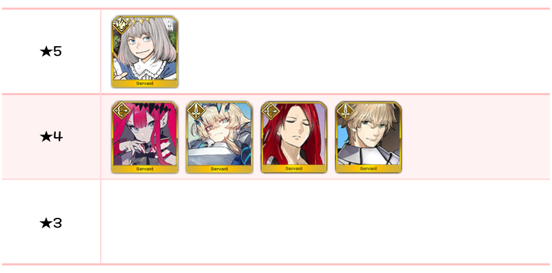 ★5 아마쿠사 시로, 디오스쿠로이, 나폴레옹, 니콜라 테슬라, 카르나, 아킬레우스, 네모, 이서문(중년), 블라드 3세 / ★4 와타나베노 츠나 / ★3 형가