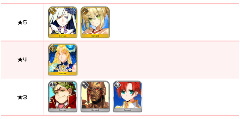 ★5 알테라, 여왕 메이브 / ★4 네로 클라우디우스, 타마모캣 / ★3 우시와카마루