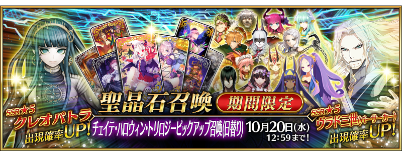 ★5 클레오파트라, 오사카베히메, 블라드 3세 / ★4 블라드 3세[EXTRA], 엘리자베트 바토리, 니토크리스(캐스터), 연청(신주쿠의 어쌔신), 카밀라(어쌔신), 무측천(불야성의 어쌔신), 이바라키도지(버서커), 타마모캣, 펜테실레이아(엘도라도의 버서커) / ★3 율리우스 카이사르, 로빈 후드, 키요히메(버서커)