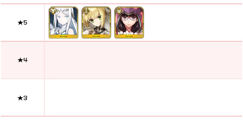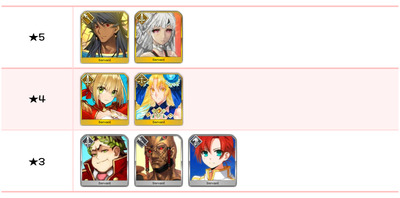 ★5 알테라, 여왕 메이브 / ★4 네로 클라우디우스, 타마모캣 / ★3 우시와카마루