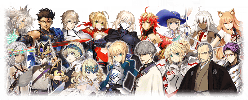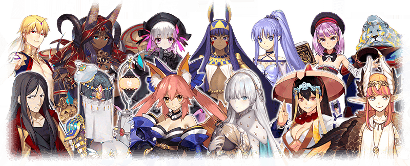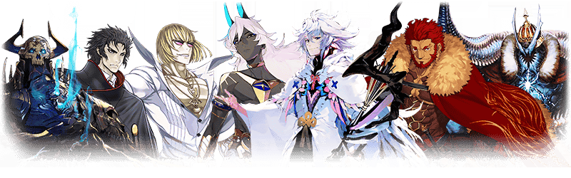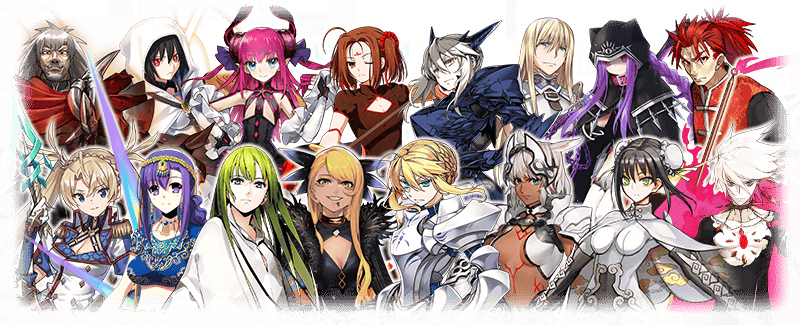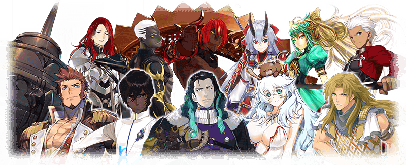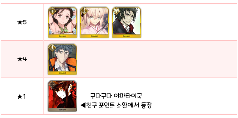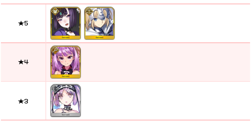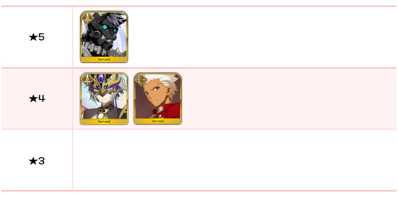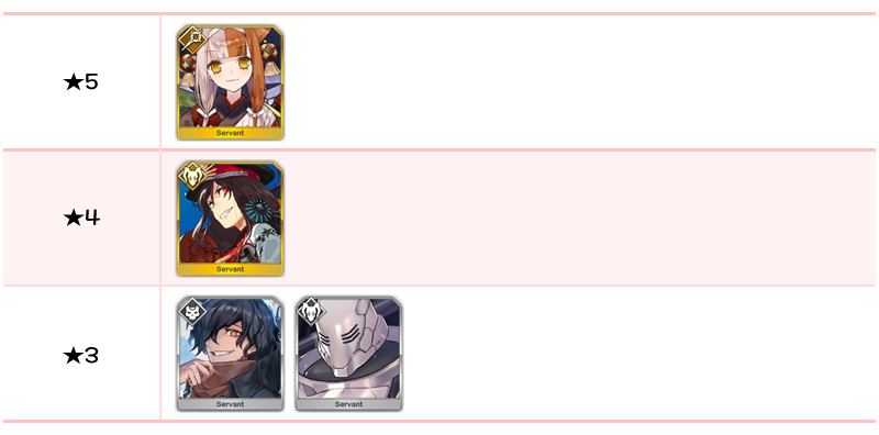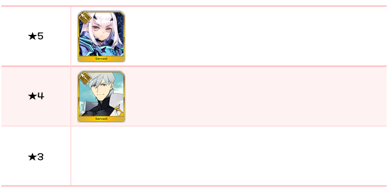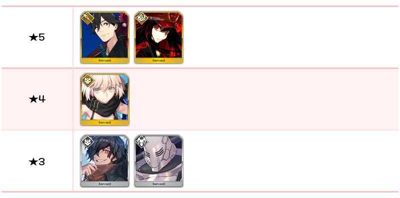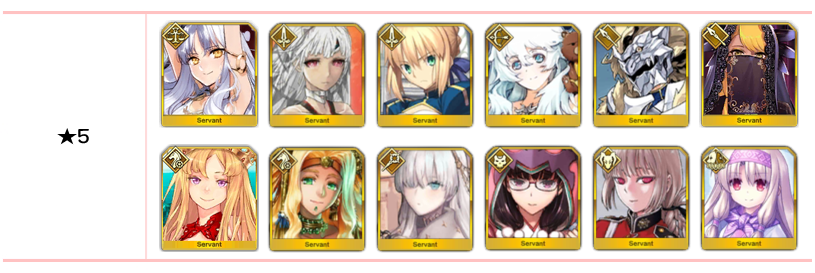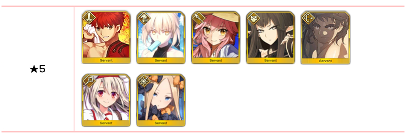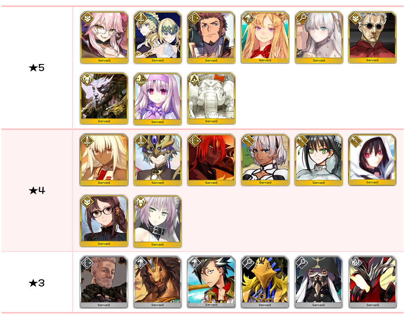 ★5 아마쿠사 시로, 아르주나, 엘키두, 오지만디아스, 오디세우스, 제갈공명, 쿠 훌린 얼터, 항우 / ★4 와타나베노 츠나 / ★3 형가