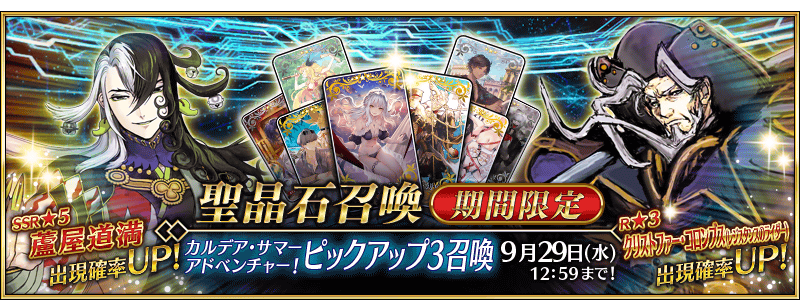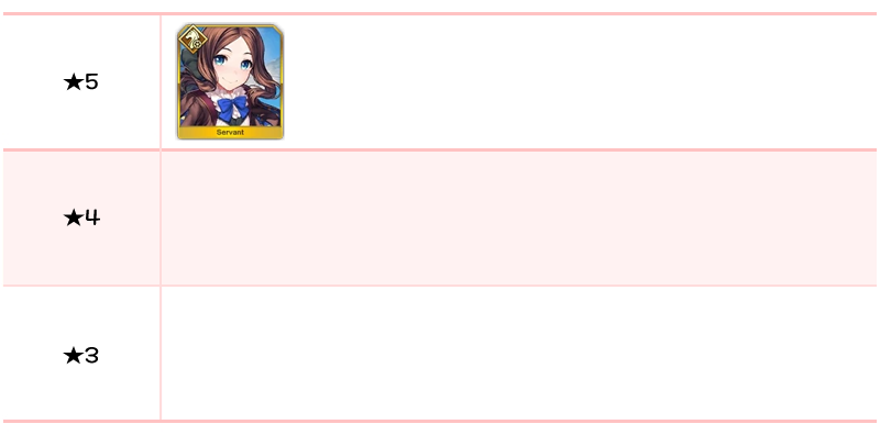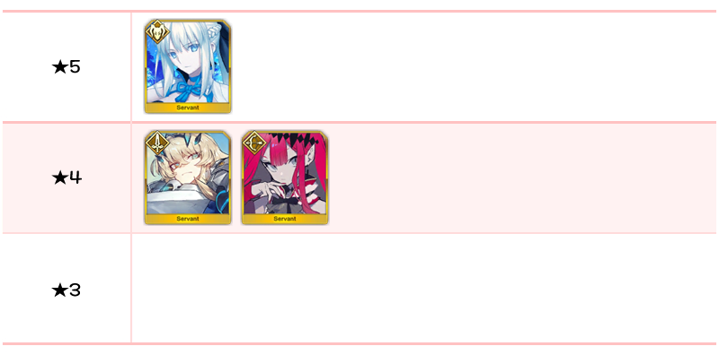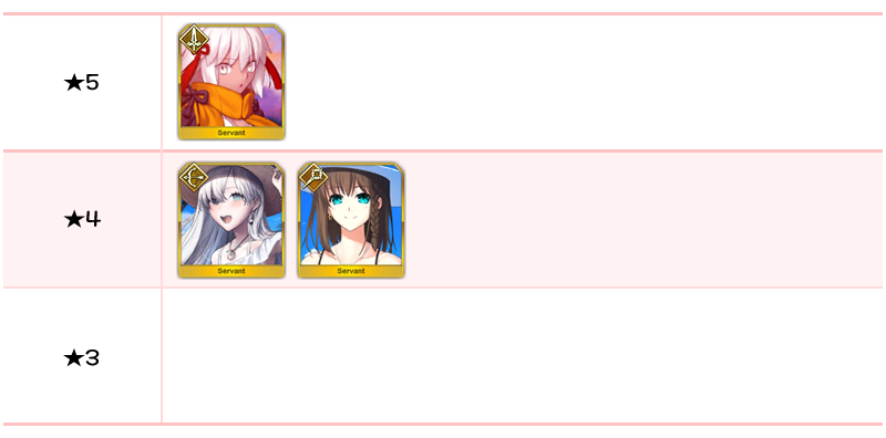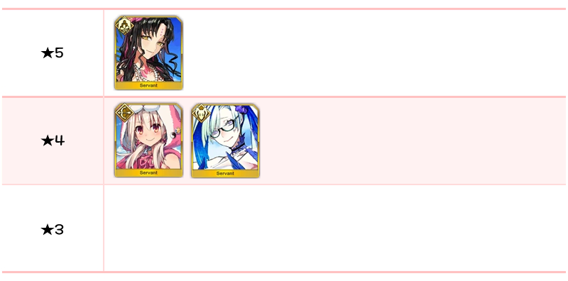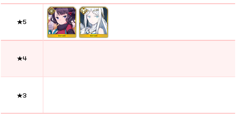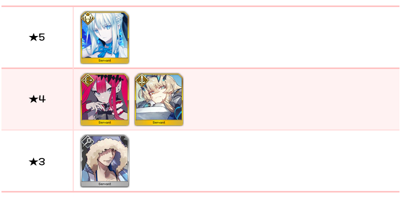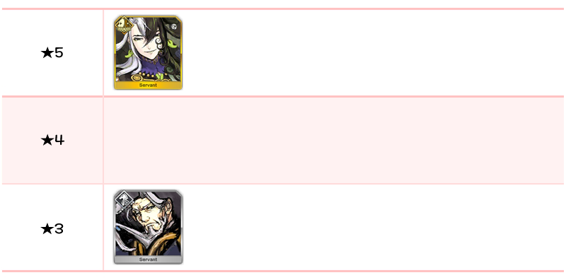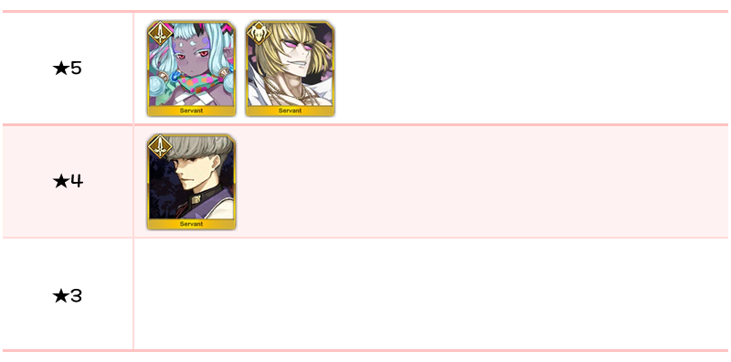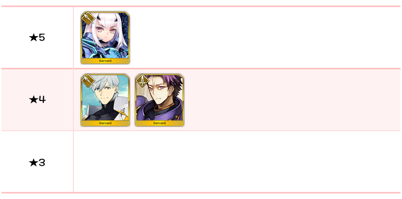 ★5 아마쿠사 시로, 디오스쿠로이, 나폴레옹, 니콜라 테슬라, 카르나, 아킬레우스, 네모, 이서문(중년), 블라드 3세 / ★4 와타나베노 츠나 / ★3 형가