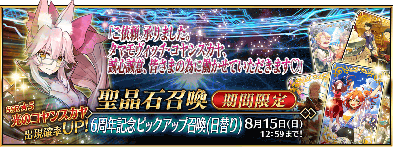 ▶6주년 기념 복주머니 소환(2021. 8. 1 ~ 8. 15) -5성 확정 가챠 ※12가지 중 하나만 가능 ※5성 서번트는 한정 서번트(빛의 코얀스카야 제외)만 등장, 4성 서번트는 한정 포함 등장, 3성 서번트는 한정 제외