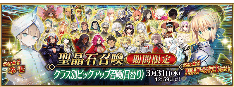 ★5 아무르[카렌], 알테라, 알트리아 펜드래곤(세이버), 오리온, 알트리아 펜드래곤(랜서), 브리트라, 에우로페, 케찰코아틀, 아나스타샤, 오사카베히메, 나이팅게일, 시토나이