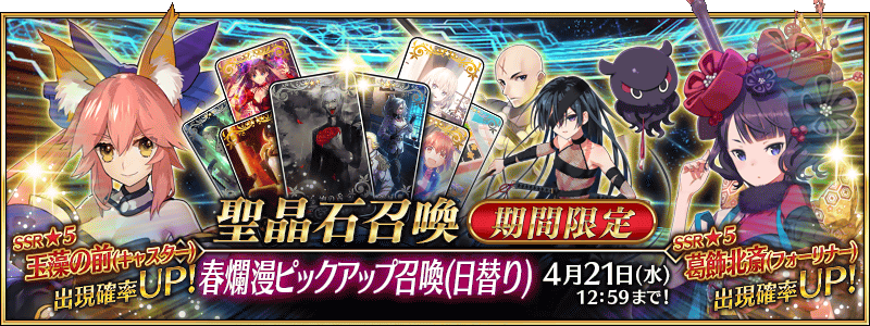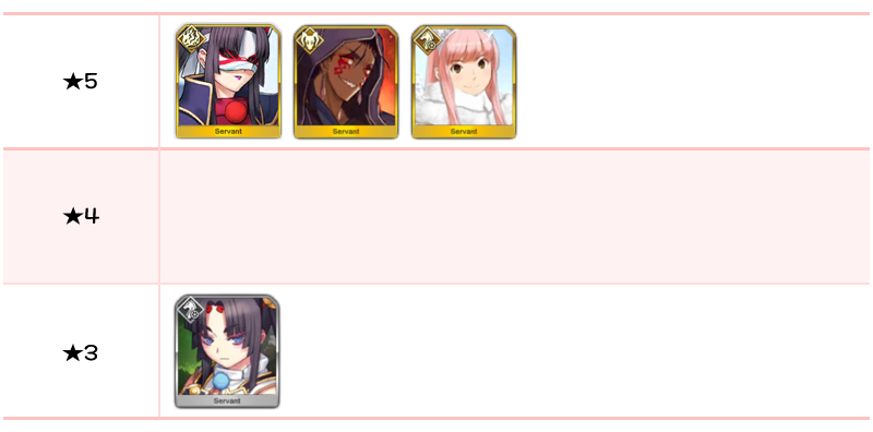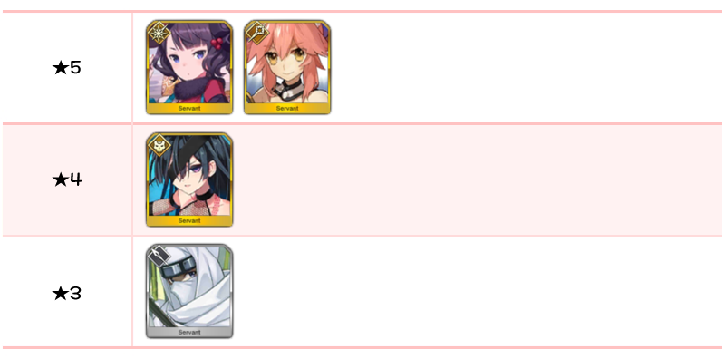 ★5 카츠시카 호쿠사이, 타마모노마에(캐스터) / ★4 모치즈키 치요메(어쌔신 파라이소) / ★3 호조인 인슌