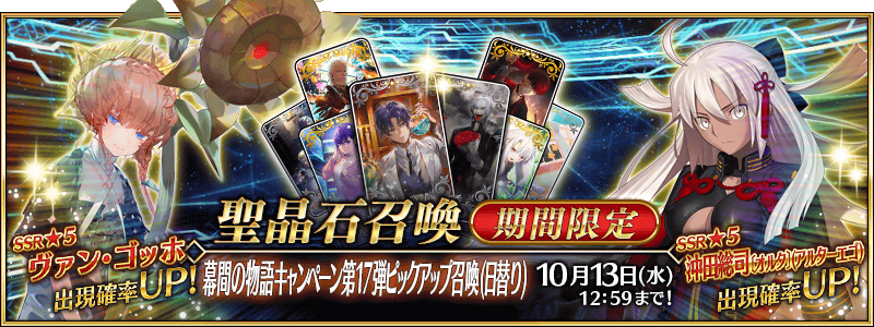 ★5 사카모토 료마(랜서), 마왕 노부나가 / ★4 오키타 J 소지 / ★3 오카다 이조(한정 3성, 친구 포인트 소환 불가), 모리 나가요시(한정 3성, 친구 포인트 소환 불가)