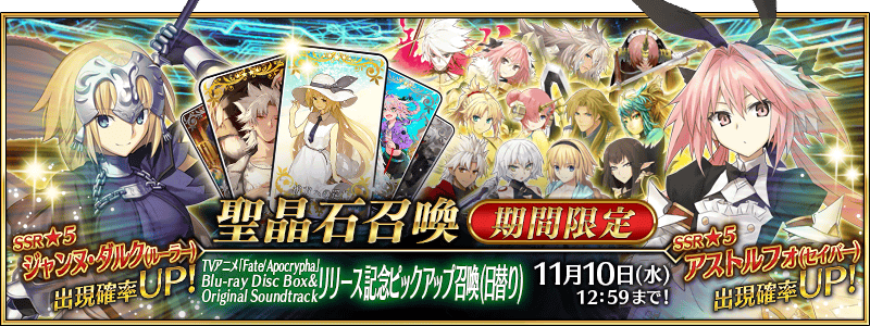 ★5 아스톨포(세이버), 잔 다르크(수영복), 잔 다르크(룰러), 세미라미스, 아마쿠사 시로, 카르나, 잭 더 리퍼 / ★4 프랑켄슈타인(수영복), 프랑켄슈타인(버서커), 모드레드(수영복), 지크프리트, 아탈란테, 케이론, 아스톨포(라이더)