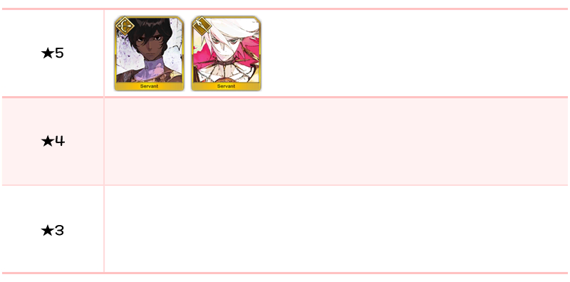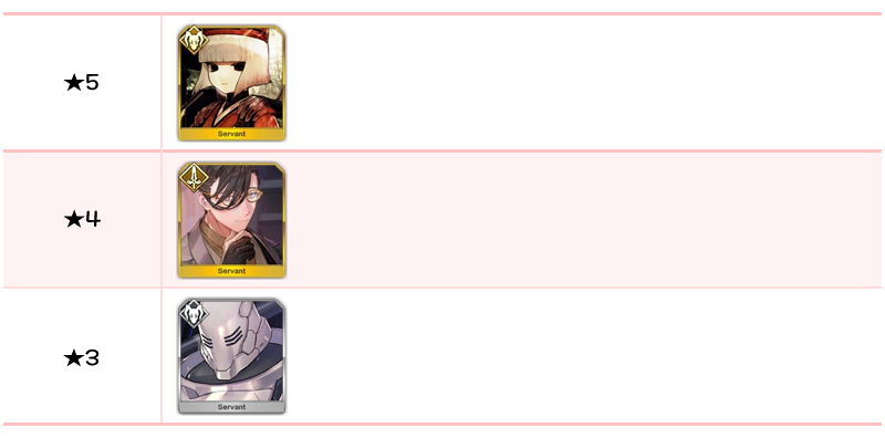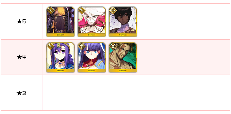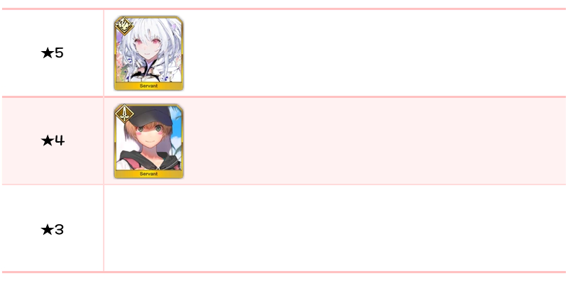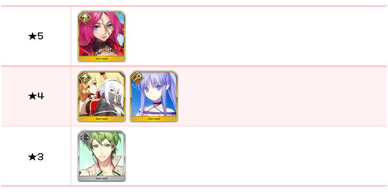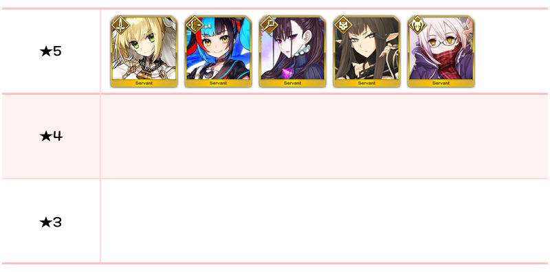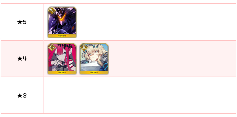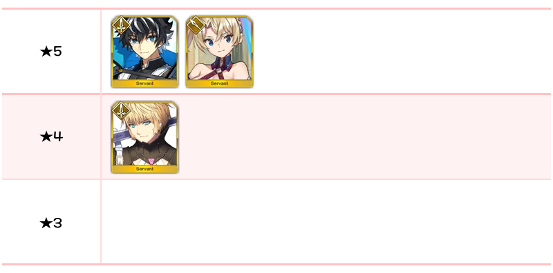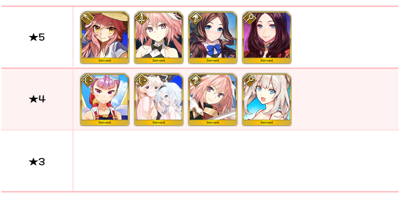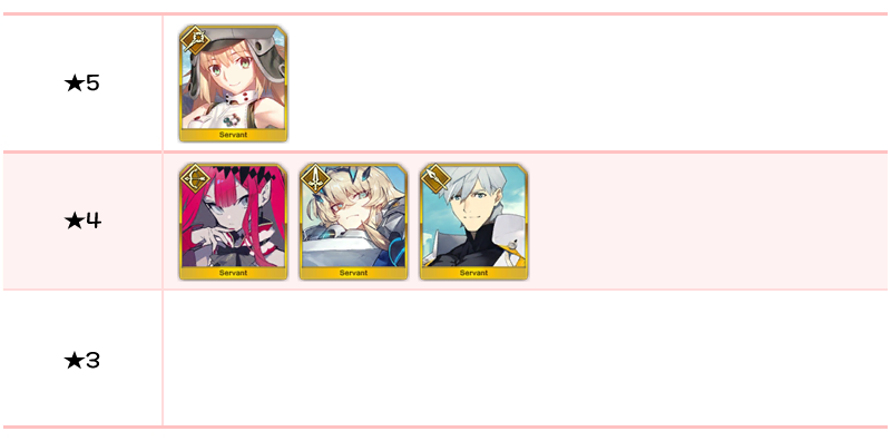 ★5 잔 다르크(룰러), 잔 다르크 얼터 / ★4 마리 앙투아네트(라이더), 랜슬롯(버서커) / ★3 질 드 레(세이버), 질 드 레(캐스터)