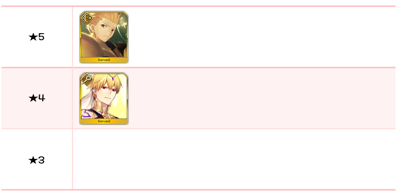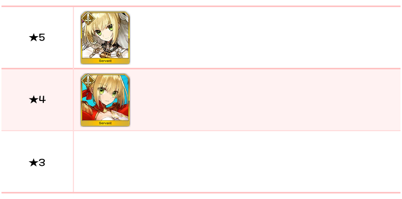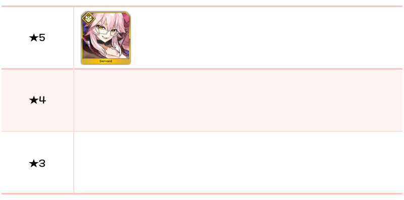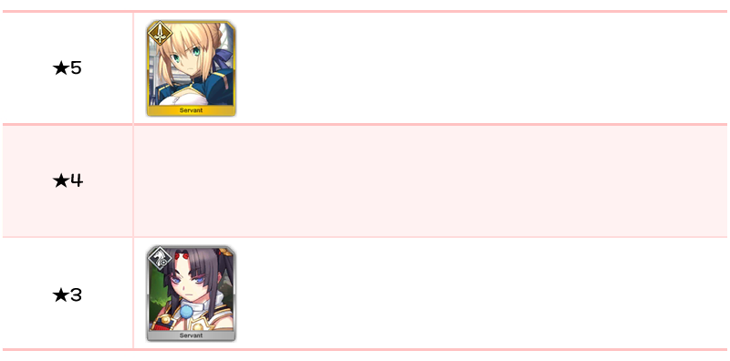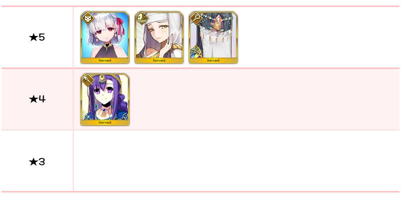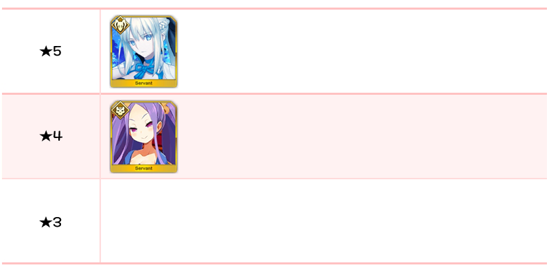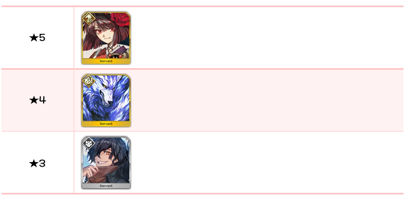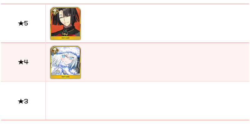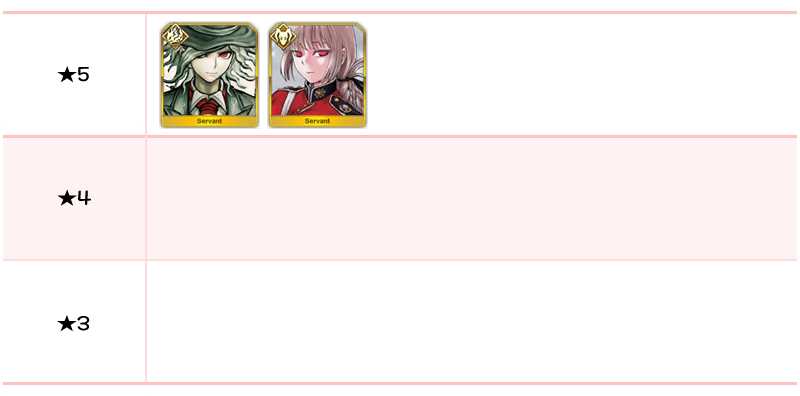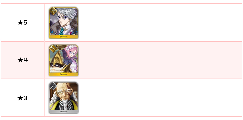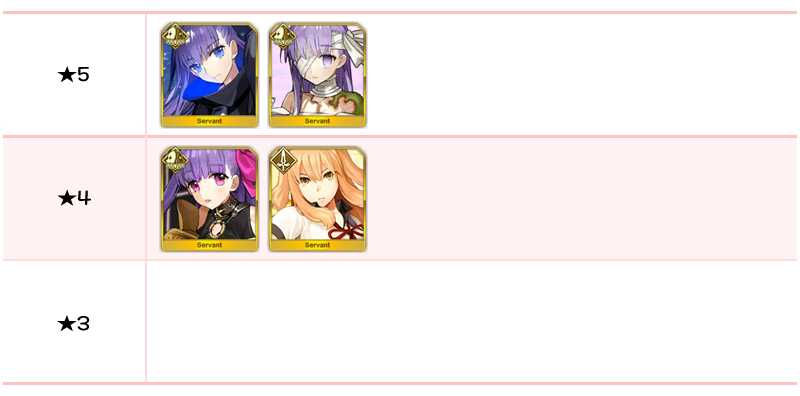 ★5 잔 다르크(룰러), 잔 다르크 얼터 / ★4 마리 앙투아네트(라이더), 랜슬롯(버서커) / ★3 질 드 레(세이버), 질 드 레(캐스터)