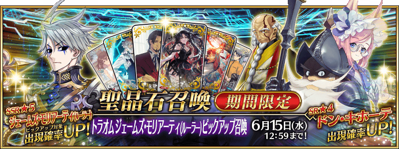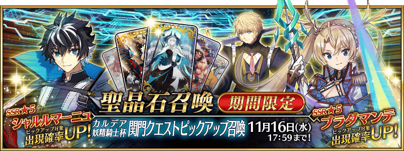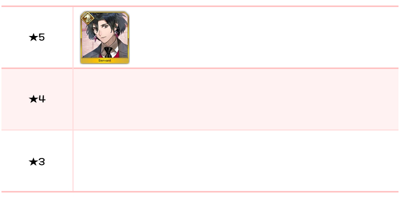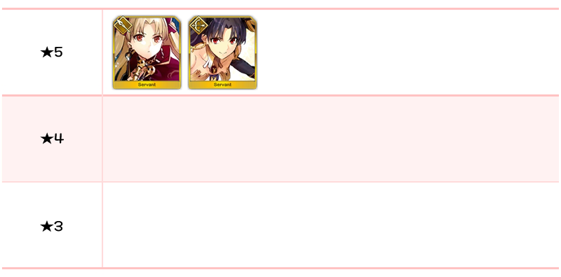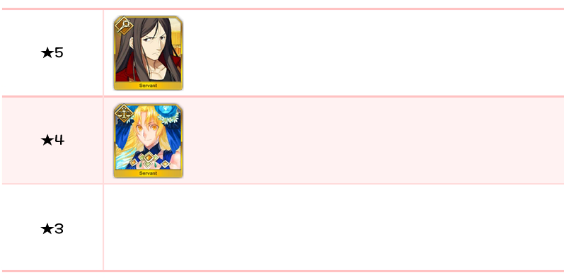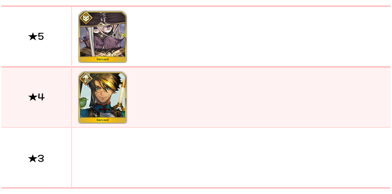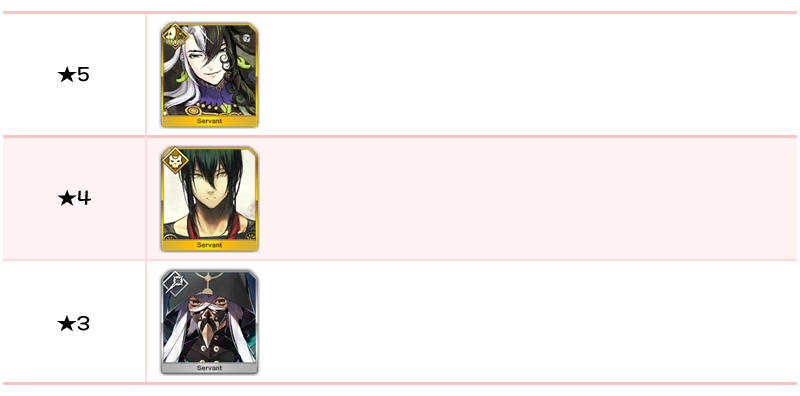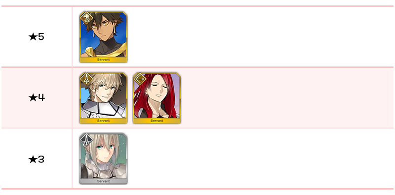 ★5 센지 무라마사, 멜뤼진(요정기사 랜슬롯), 오베론 / ★4 퍼시벌 / ★3 쿠 훌린(캐스터), 적토마
