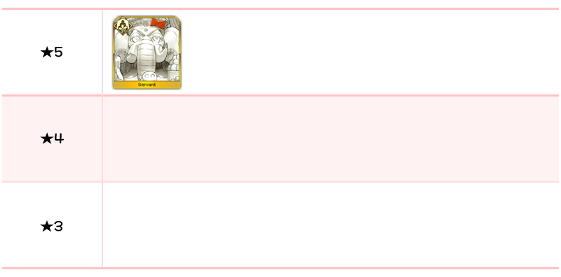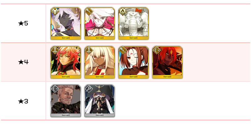 ★5 아르주나 얼터, 카르나, 지나코 카리기리(위대한 석상신) / ★4 라마, 락슈미 바이, 나타, 아슈바타만 / ★3 윌리엄 텔, 아스클레피오스