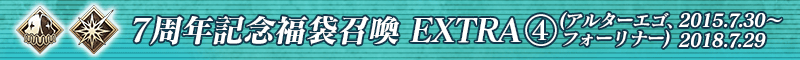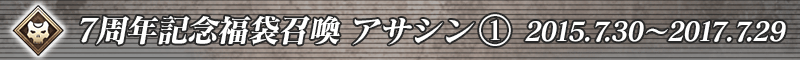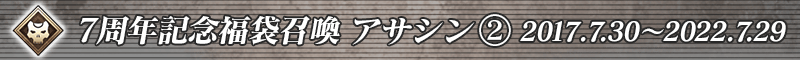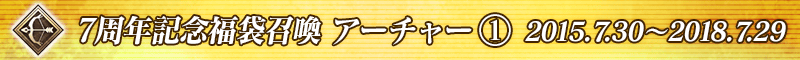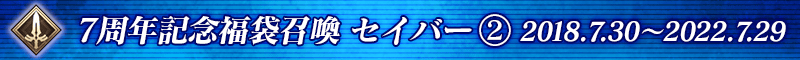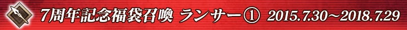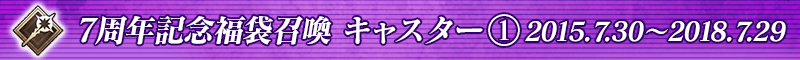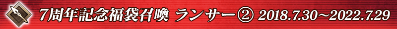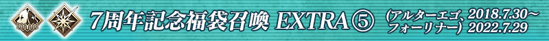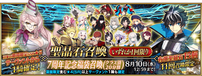▶7주년 기념 복주머니 소환(2022. 7. 31 ~ 8. 10) -5성 확정 가챠 ※20 종류 중 하나만 가능 ※5성 서번트는 한정 서번트(아키타입: 어스 제외)만 등장, 4성 서번트는 한정 포함 등장, 3성 서번트는 한정 제외
