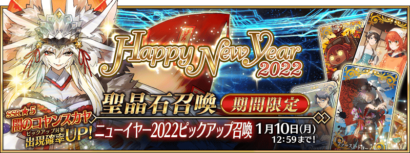 ▶복주머니 소환 2022(2022. 1. 1 ~ 1. 10) -5성 확정 가챠 ※14 종류 중 하나만 가능 ※5성 서번트는 한정 서번트(어둠의 코얀스카야 제외)만 등장