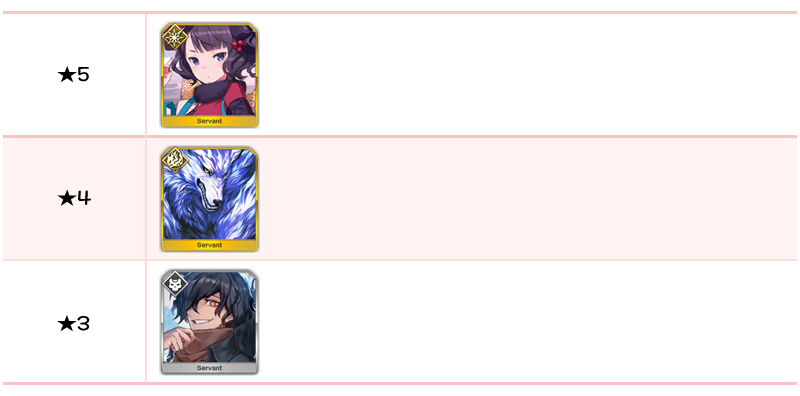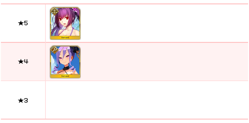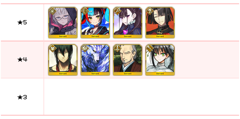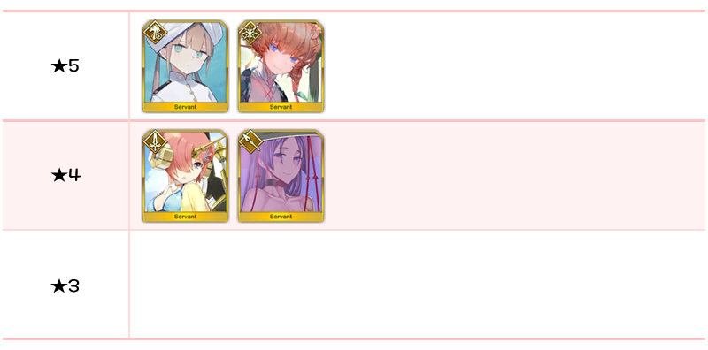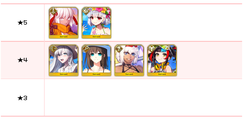 ★5 료기 시키(세이버), 네로 클라우디우스(수영복), 수수께끼의 히로인 X, 보이저, 미야모토 무사시(수영복), 애비게일 윌리엄스[여름](수영복), 아인츠베른 폰 이리야스필 / ★4 우시와카마루(수영복), 무라사키 시키부(수영복) / ★3 서복