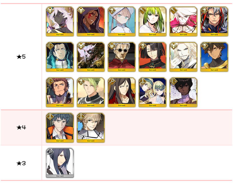 ★5 아르주나 얼터, 쿠 훌린 얼터, 네모, 엘키두, 카르나, 오디세우스, 니콜라 테슬라, 항우, 이서문(중년), 태공망, 블라드 3세, 오지만디아스, 나폴레옹, 아킬레우스, 제갈공명, 디오스쿠로이, 아르주나 / ★4 사이토 하지메, 가웨인 / ★3 파라켈수스