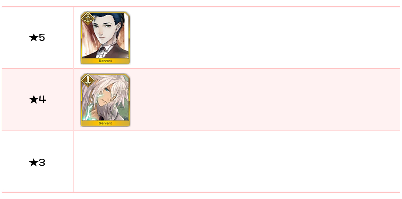 ★5 모드레드, 잭 더 리퍼 / ★4 너서리 라임, 알트리아 펜드래곤 얼터(랜서) / ★3 찰스 배비지, 헨리 지킬&하이드