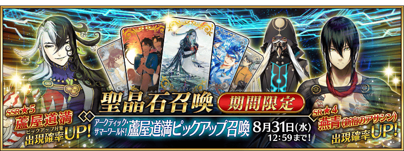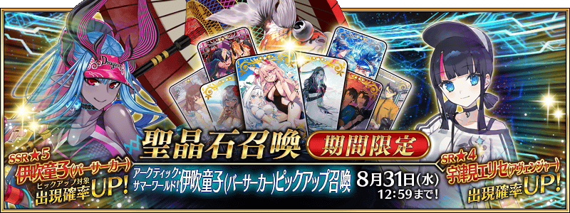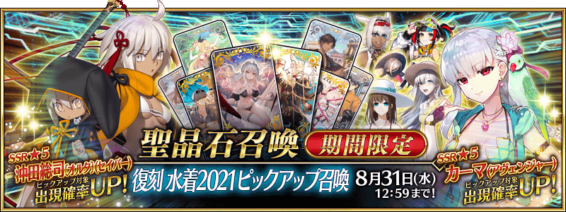 ★5 알트리아 펜드래곤(아처), 알트리아 펜드래곤 얼터(라이더), 잔 다르크(수영복), 알트리아 펜드래곤(룰러), 셋쇼인 키아라(수영복) / ★4 키요히메(수영복), 모드레드(수영복), 마르타(수영복), 니토크리스(수영복), 여왕 메이브(수영복), 이바라키도지(수영복), 카밀라(수영복), 토모에고젠(수영복), 이리야스필 폰 아인츠베른(수영복), 브륀힐드(수영복)
