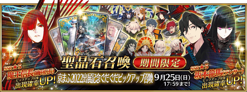 ★5 마왕 노부나가, 오키타 소지, 사카모토 료마(랜서), 히지카타 토시조, 이즈모노 오쿠니, 히미코, 오키타 소지 얼터 / ★4 오다 노부나가(수영복), 오키타 소지(수영복), 사이토 하지메 / ★3 모리 나가요시