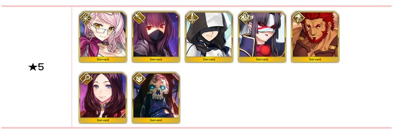 ★5 마나난 막 리르[바제트], 시토나이, 케찰코아틀, 알트리아 펜드래곤(랜서), 여왕 메이브, 오리온, 셰에라자드(불야성의 캐스터), 에우로페, 디오스쿠로이, 위대한 석상신, 브라다만테, 브리트라, 타마모노마에(캐스터), 알테라, 모드레드, 현장 삼장, 아나스타샤, 알트리아 펜드래곤(세이버), 프랜시스 드레이크, 오사카베히메, 잭 더 리퍼, 잔 다르크(룰러), 갈라테아, 나이팅게일